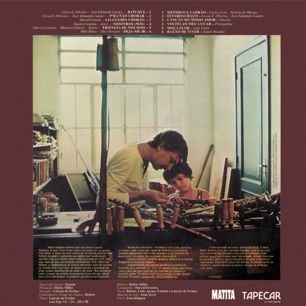 Esse é um dos discos mais disputados no mercado do vinil fora do país, sendo seu relançamento um pedido constante. Agora, depois de muito cuidado na produção, atendemos a esse pedido com uma edição ESPECIAL em vinil preto, encarte inédito e prensagem Rocinante. Aqui, Bebeto Castilho canta romances, composições de Vinicius de Moraes, Joyce, Danilo Caymmi, além de outras feitas para o disco, como a biográfica "Batuque".